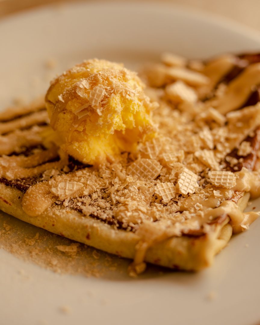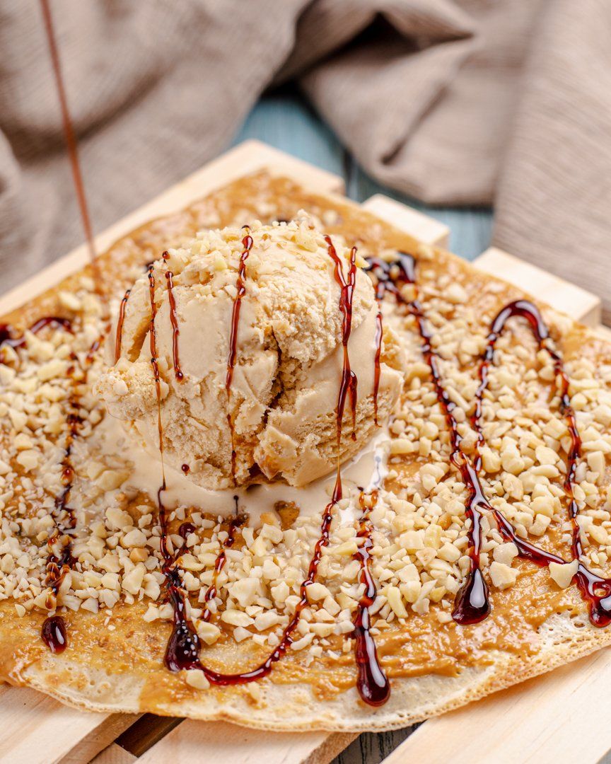 También ofrecemos crepes especiales con helados y frutas, nata, almendras, nueces, coco rallado, etc.