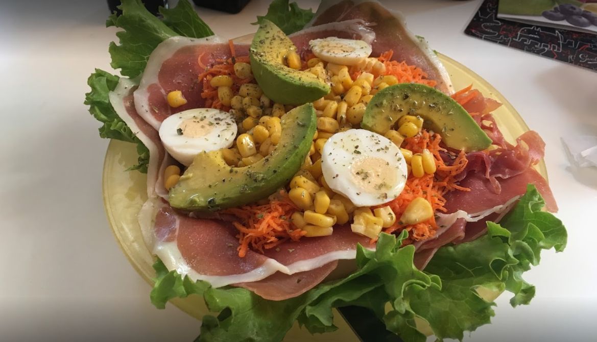 Lechuga, tomate, jamón, queso, crouton, huevo, mayonesa, orégano.