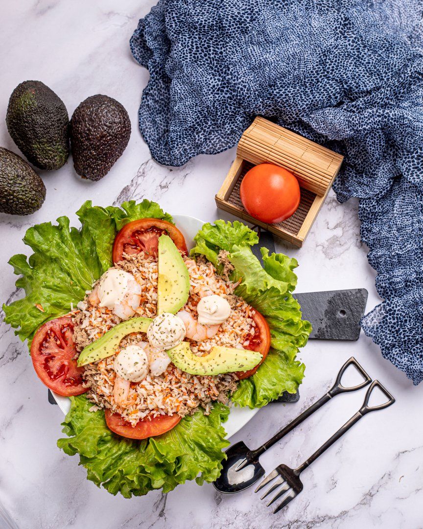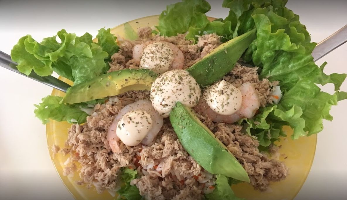 Lechuga, tomate, cangrejo, atún, aguacate, gambas, salsa rosa, orégano.