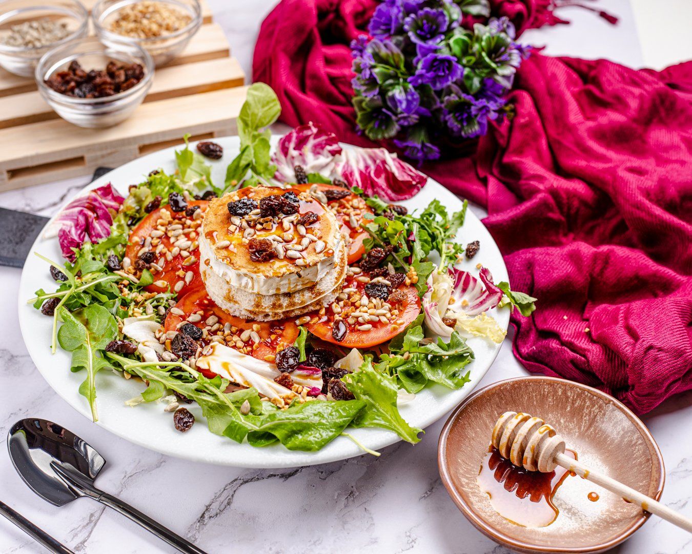 Lechuga mezclum, rúcula, tomate, pan de molde, queso cabra pasado por la plancha, pipas, pasas, almendras y miel de palma.